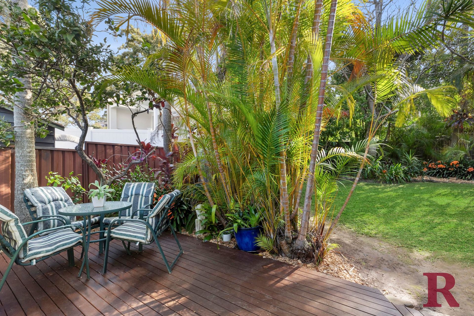 - Timber decking flowing into an immaculate landscaped garden featuring storage sheds