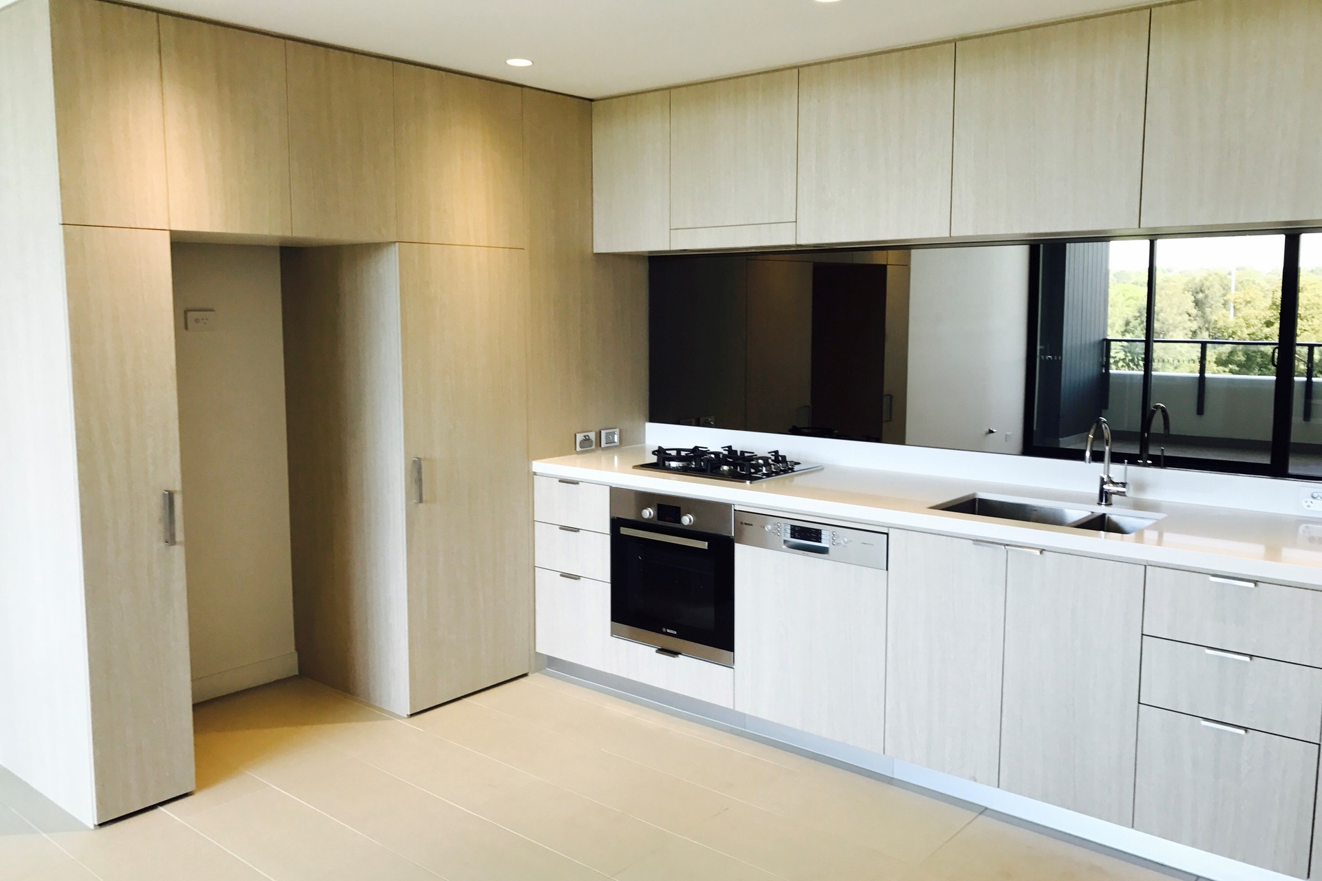 - Sleek kitchen with gas cook top, stone top benches and stainless steel appliances