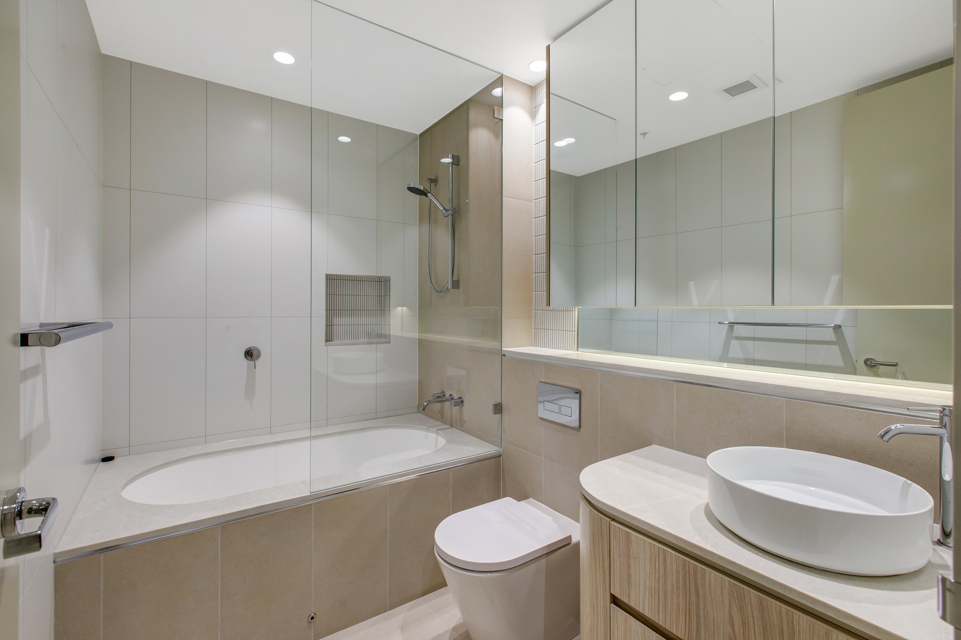 - Both bathrooms boasting designer fixtures and floor to ceiling tiles, main with large bathtub