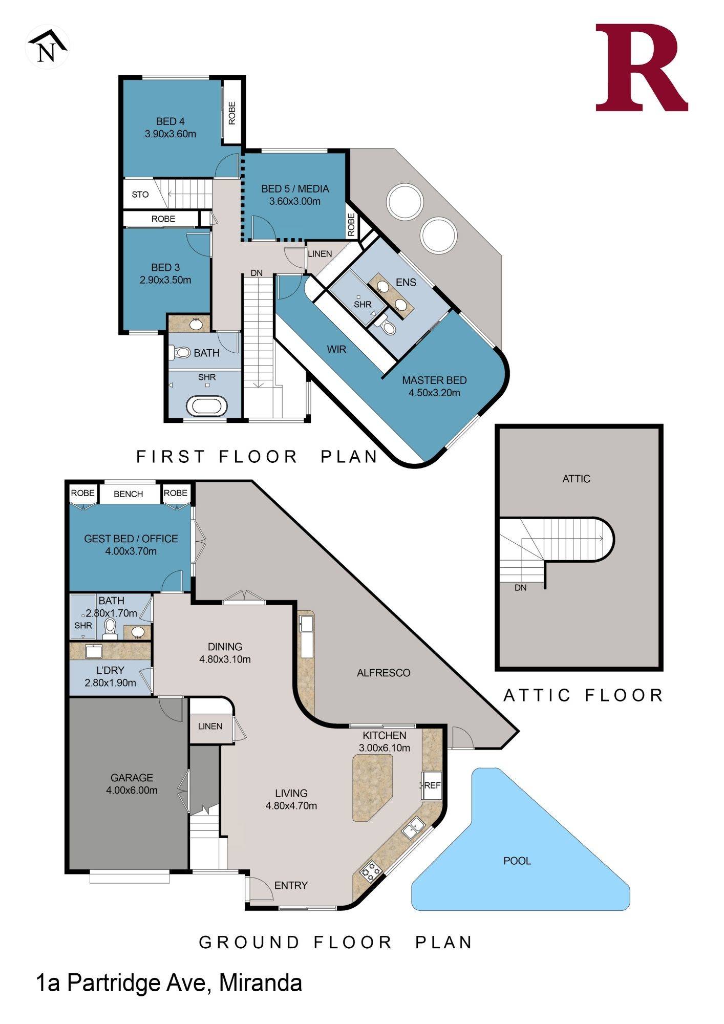 The flexible layout is designed with growing families in mind. The oversized master retreat boasts a luxurious ensuite and walk-in wardrobe, while two additional king-sized bedrooms upstairs feature built-ins. A fourth bedroom, also upstairs, offers versatility as a study or nursery, and a guest bedroom downstairs ensures space and privacy for all.